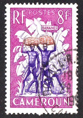 Auf diesen beiden Marken aus Kamerun sehen wir Helfer bei der Bananenernte.