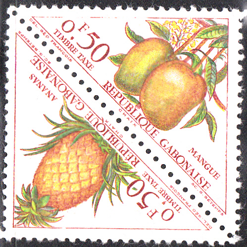 Auf der Portomarke aus Gabun links oben (MiNr 34) zeigt eine Ananas. Die beiden zuletzt gezeigten Portomarken wurden jeweils zusammengedruckt verausgabt.