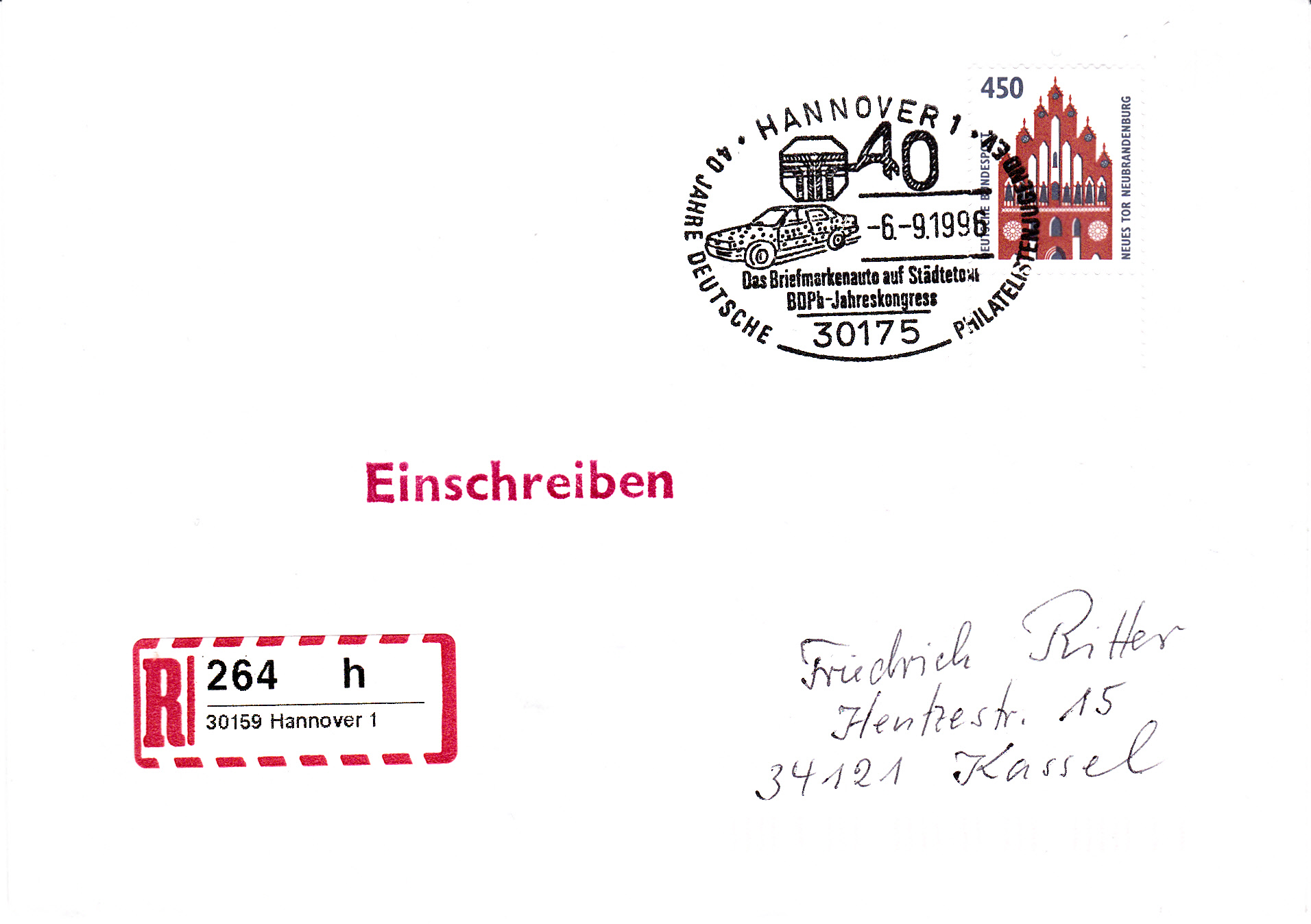 1996 wurde die Deutsche Philatelisten Jugend e.V. 40 Jahre alt. Aus diesem Anlass wurden zahlreich Veranstaltungen mit dem Briefmarkenauto angefahren. Hierzu gab es beim Bundestag des BDPh einen Sonderstempel mit Abbildung des Briefmarkenautos der DPhJ. Hier ein Einschreibebrief mit dem Stempel.