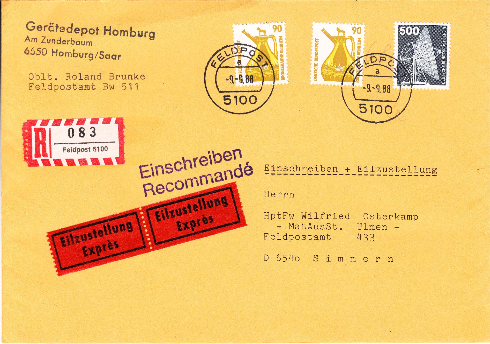 Dieser mit 680 Pf portogerecht frankierte Brief von 21 bis 50 g (130 Pf) per Einschreiben (200 Pf) sowie Eilzustellung (350 Pf) mit Absenderangabe Gerätedepot Homburg wurde am 09.09.1988 bei der Feldpostleitstelle Homburg aufgegeben, die den Tagesstempel 5100 a führte: