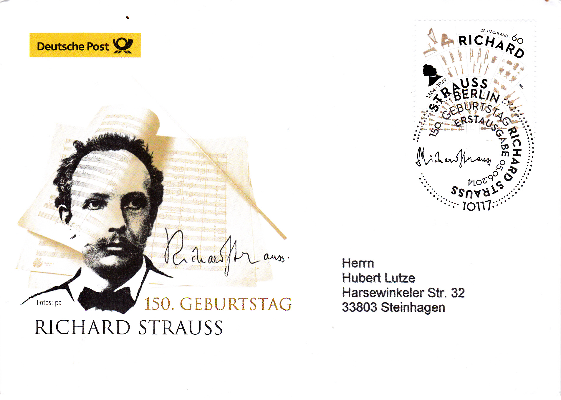 Die bereits gezeigte Marke zum 50. Todestag von Richard Strauss der Deutschen Post (MiNr 2076) zeige ich hier als Eckrandstück mit dem Ersttagsonderstempel Berlin.