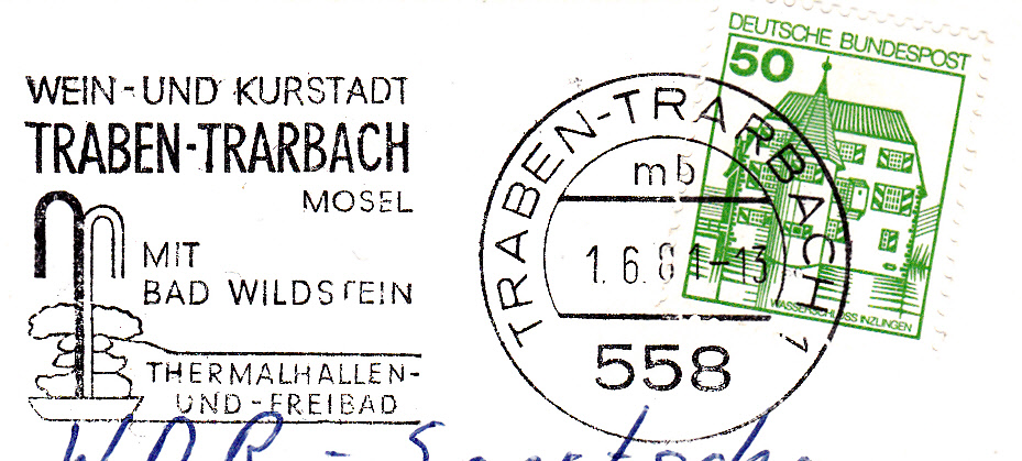 Hier ein weiterer Handwerbestempel aus Schweich vom 9.1.1985, der an die Stadtwerdung vom 30.5.1984 erinnert und mit der Inschrift "Alter Weinort, Junge Stadt" wirbt.