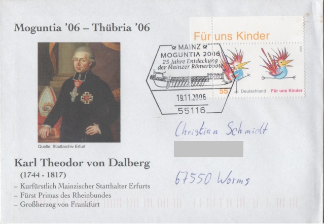 Als im Jahr 2006 in Mainz die Briefmarkenausstellung MOGUNTIA 2006 stattfand, erinnerte nicht nur der Ausstellungsname an die römische Geschichte der Stadt. Ein Sonderstempel war dem 25-jährigen Jubiläum der Entdeckung der römischen Schiffe gewidmet: