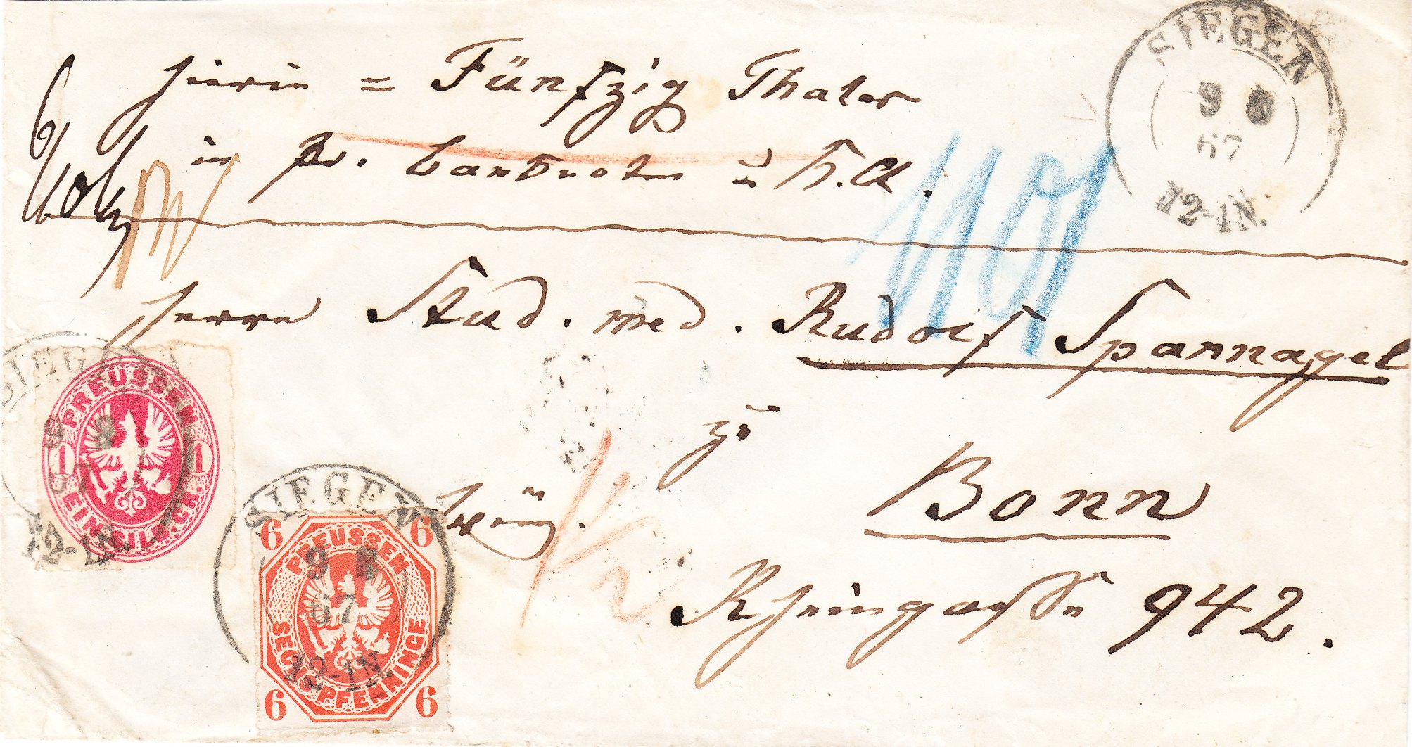 Dieser nach Bonn adressierte Brief wurde am 09.08.1867 in SIEGEN aufgegeben: