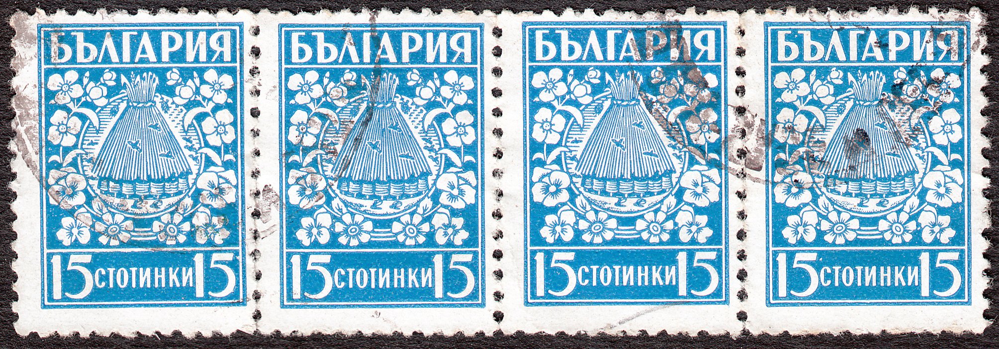 Diese Freimarke aus Bulgarien, MiNr. 408 x, zeigt als Motiv einen Bienenkorb, ringsum von Blüten umgeben, hier gleich als waagerechter Viererstreifen, genauso wie die Bienenkörbe auch in natura nebeneinander aufgestellt werden: