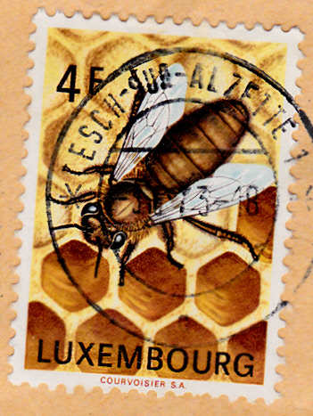 Diese Marke aus Luxemburg (MiNr 864) zeigt eine Biene auf einer Honigwabe.