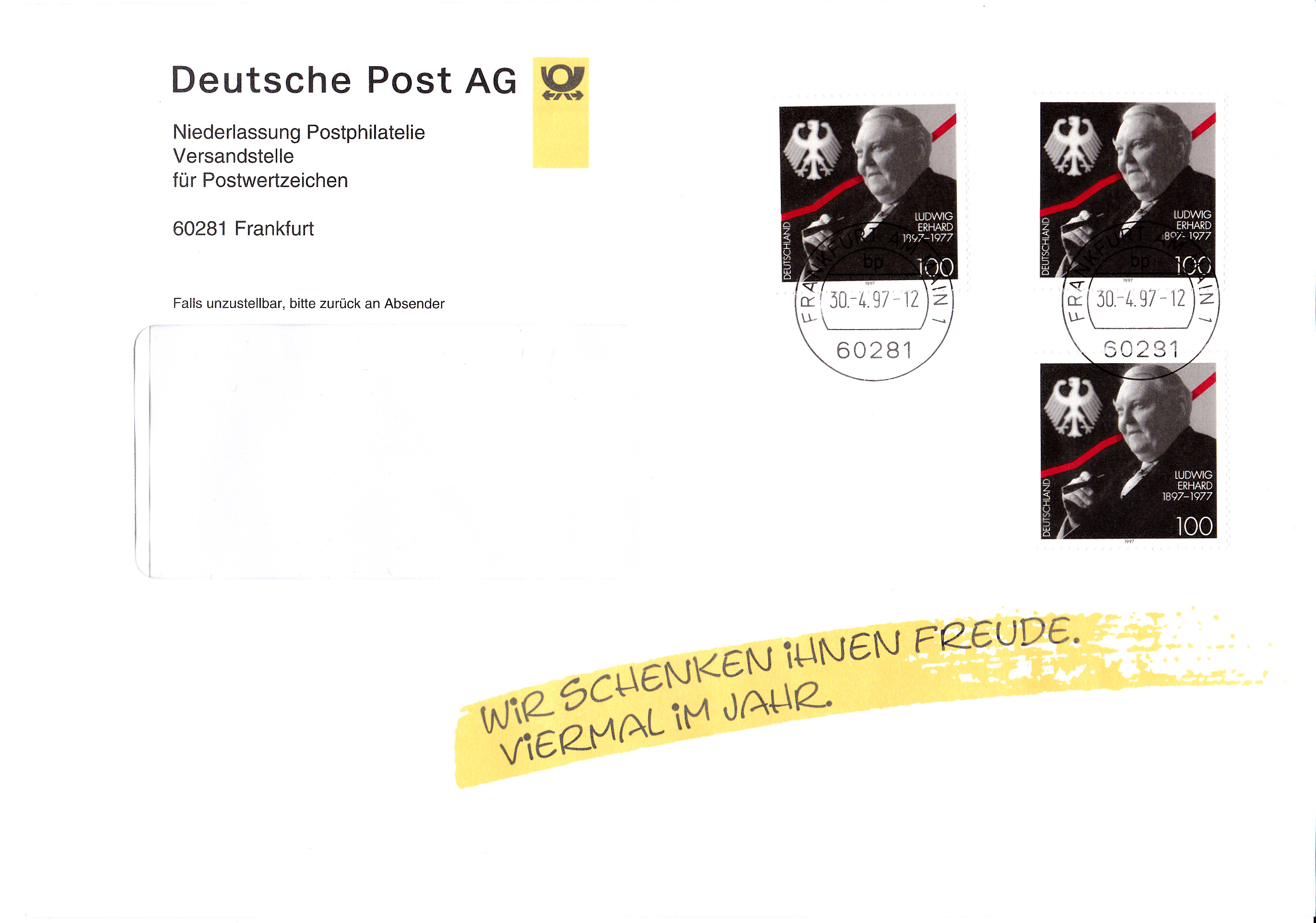 Drei Werte der Sondermarke 100. Geburtstag von Ludwig Erhard (MiNr 1904) sind hier auf einem Umschlag der Versandstelle für Postwertzeichen am 30.4.1997 zur Frankatur eines Briefes von 51 bis 500 g benutzt worden.