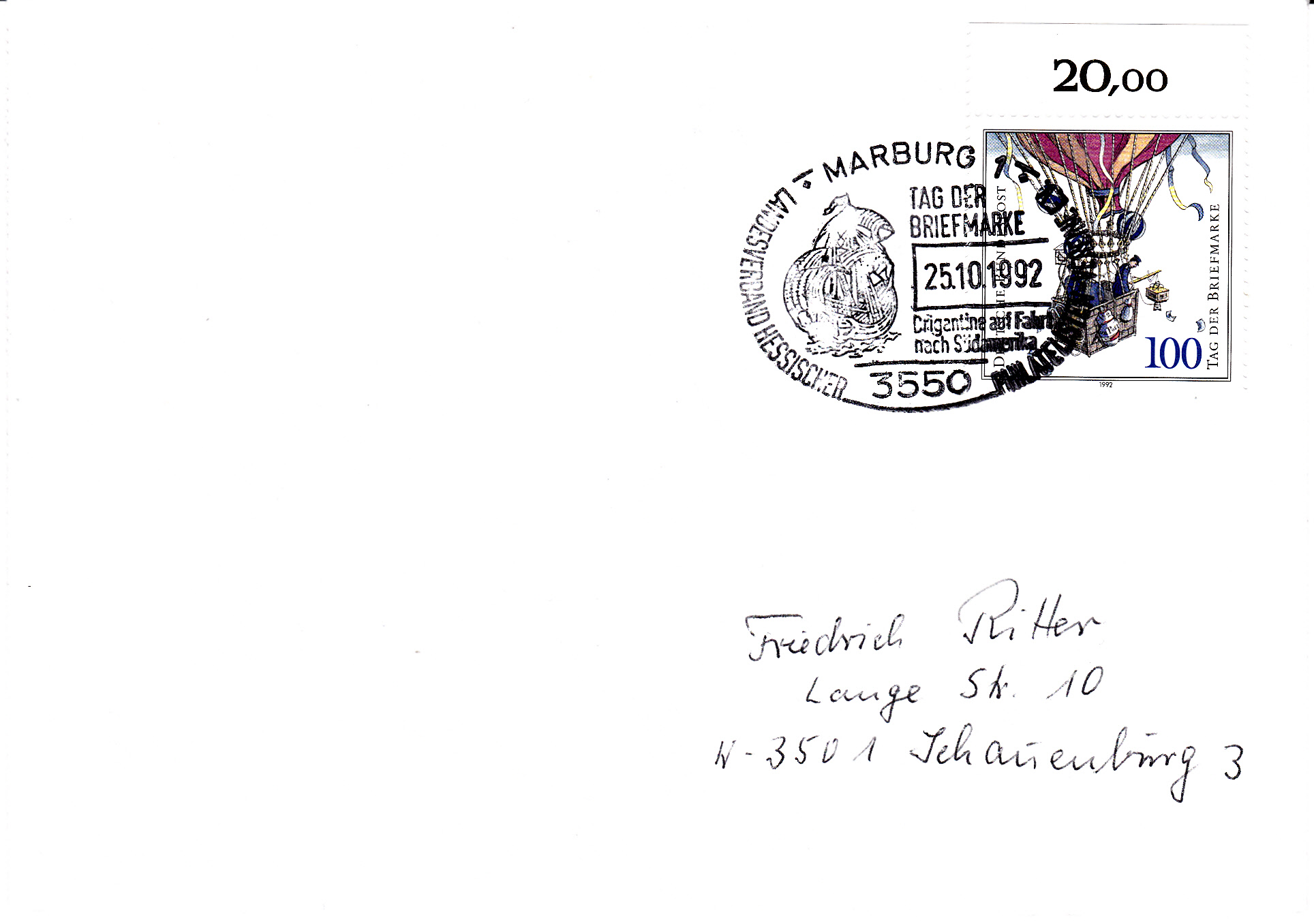 Der bereits auf einer Ganzsache gezeigte Sonderstempel zum Tag der Briefmarke aus W-3550 Marburg hier auf einem echt gelaufenen Brief.