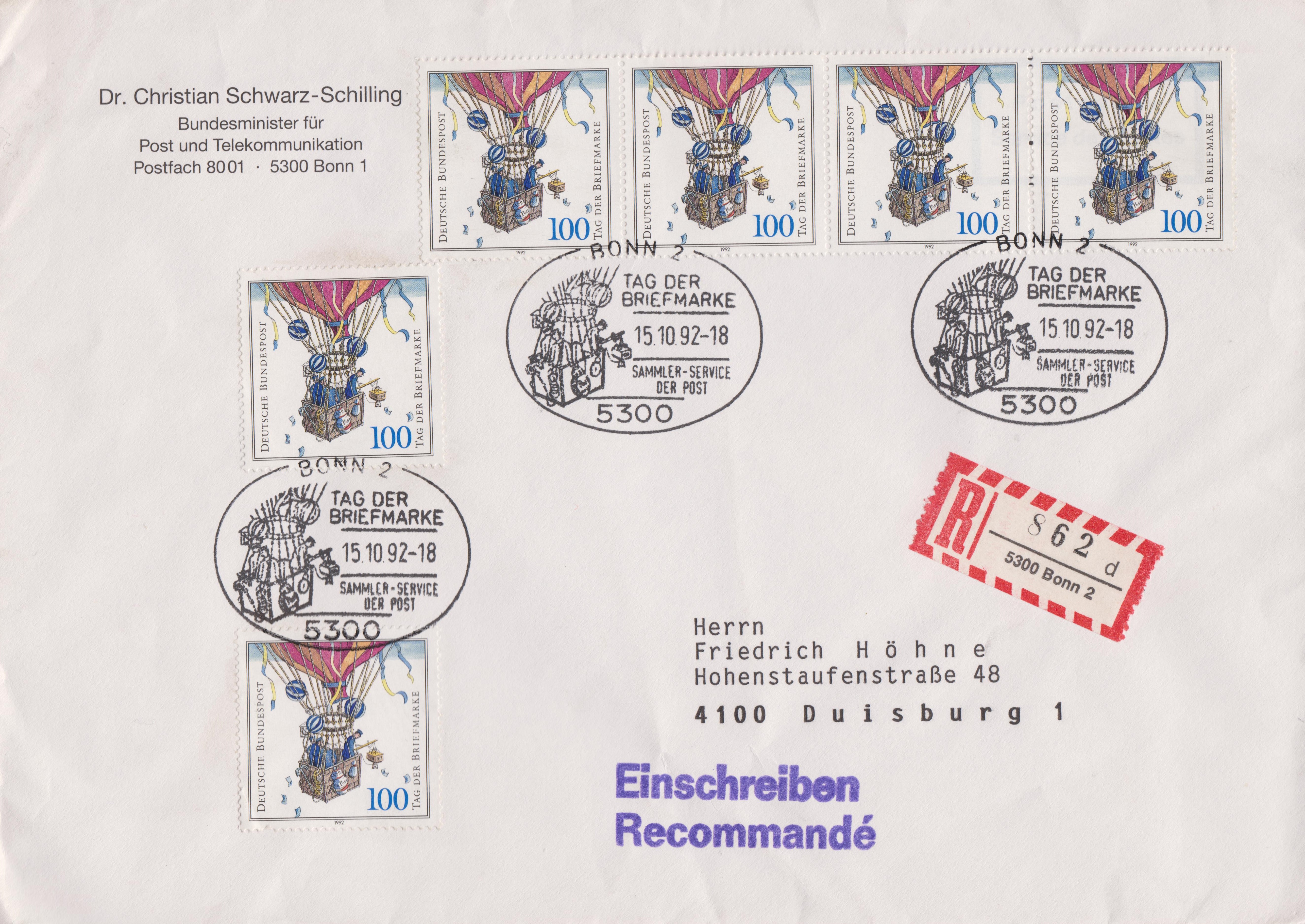 Ministerkarte des Bundesministers für Post und Telekommunikation mit der Marke zum Tag der Briefmarke 1992 und dem Ersttagsonderstempel Bonn.