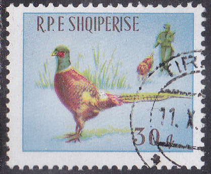 Eine weitere Marke aus Albanien (MiNr 984) zeigte ein Bild zur Fasanenjagd.