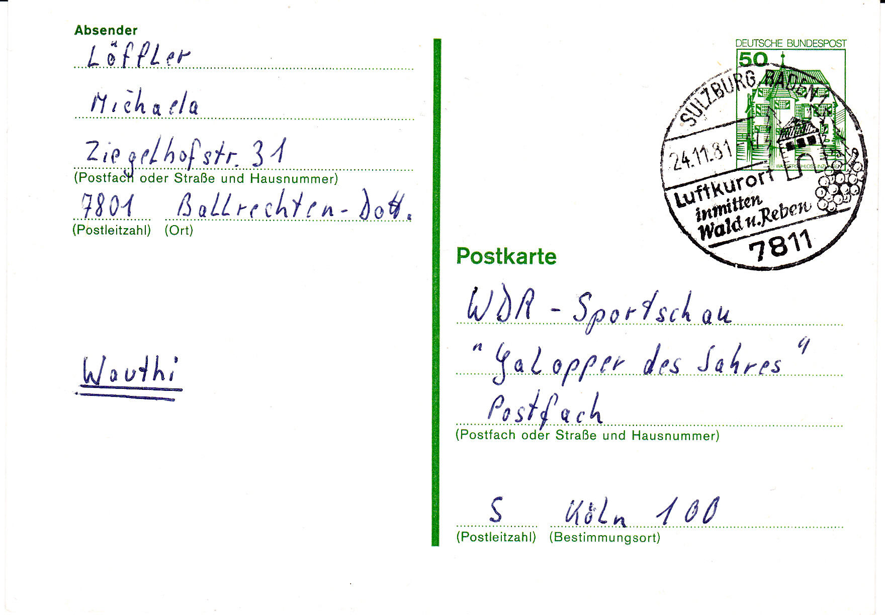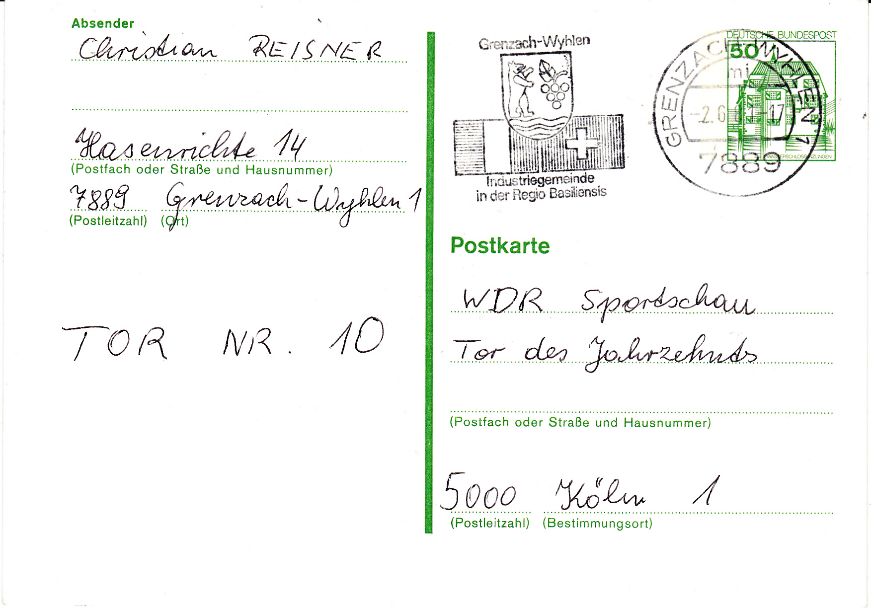 Dieser Maschinenwerbestempel aus Grenzach-Wyhlen vom 2.6.1981 zeigt das Stadtwappen. Im Stadtwappen sehen wir Weintrauben, die symbolisch für den Weinbau in dieser Gegend stehen.