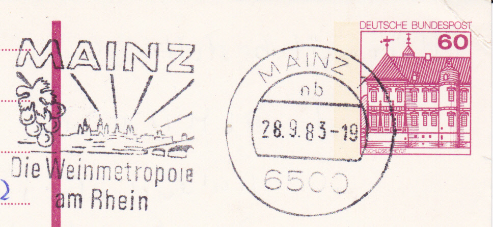 Maschinenwerbestempel aus 6500 Mainz vom 28.9.1983 mit Werbeeinsatz "MAINZ Die Weinmetrople am Rhein" und mit Abbildung von Weintrauben.