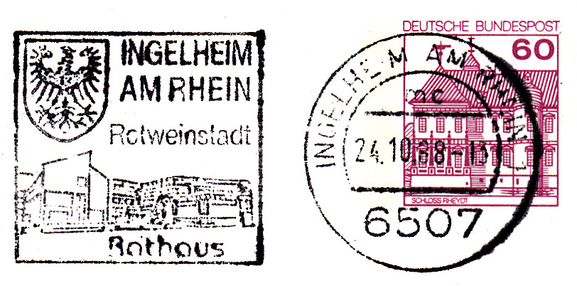Handwerbestempel aus 6507 Ingelheim vom 24.10.1988 mit Werbung für die "Rotweinstadt".