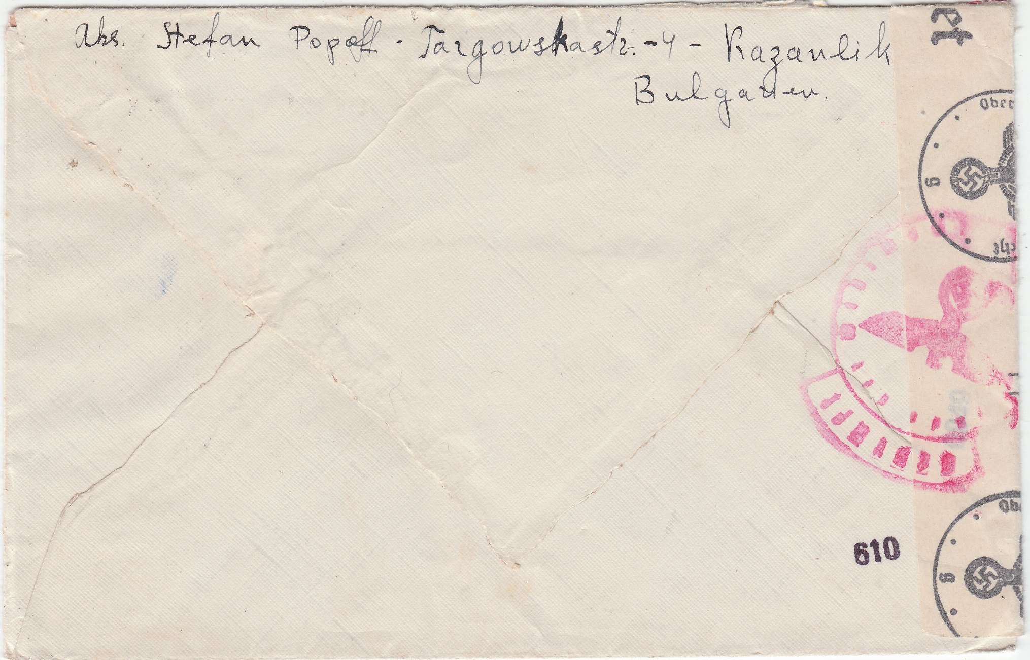 Dieser nach Darmstadt adressierte, am 29.08.1941 in Казанлък = Kazanlak in Bulgarien aufgegebene Brief wurde in der Auslandsbriefprüfstelle Wien linksseitig geöffnet und nach erfolgter Zensurierung mit einem Verschlußstreifen, Landsmann GV2.4, wieder verschlossen, was mit einem Prüfstempel in Rot, Landsmann GP1.4, dokumentiert wurde: