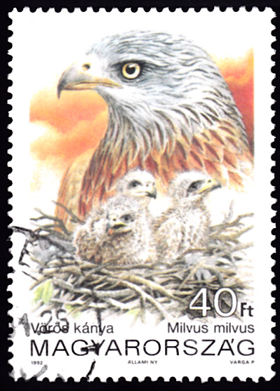 Aus Ungarn kommt diese Marke (MiNr 4205) mit einem Rotmilan (Milvus milvus) und seinem Nest mit drei Jungvögel.