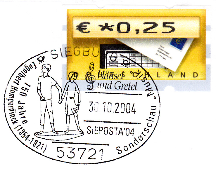 Auf diesem Sonderstempel aus Siegburg, der Geburtsstadt von Humperdinck, zu seinem 150. Geburtstag sind Hänsel und Gretel im Stempelmotiv zu sehen.