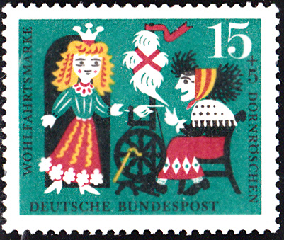 Bereits die Wohlfahrtsmarken 1964 zeigten Motive aus Dornröschen. Die Marke zu 10+5 Pf (MiNr 447) zeigt wie die Böse Fee den Fluch ausspricht.