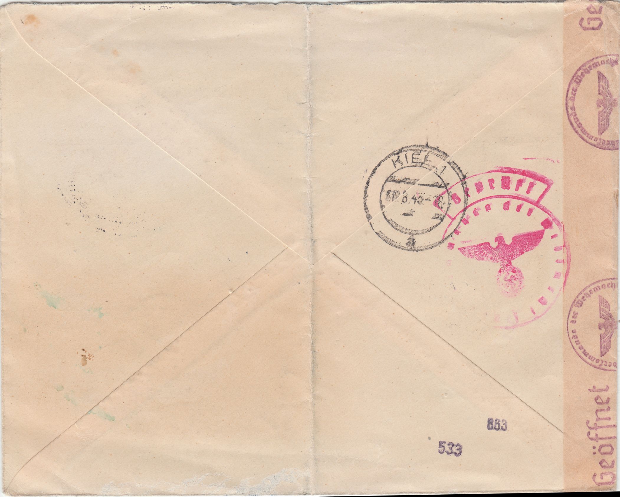Dieser nach Kiel adressierte, am 02.08.1943 in Sofia in Bulgarien per Einchreiben aufgegebene Brief wurde in der Auslandsbriefprüfstelle Wien linksseitig geöffnet und nach erfolgter Zensurierung mit einem Verschlußstreifen, Landsmann GV2.4, wieder verschlossen, was mit einem Prüfstempel in Rot, Landsmann GP1.5, dokumentiert wurde: