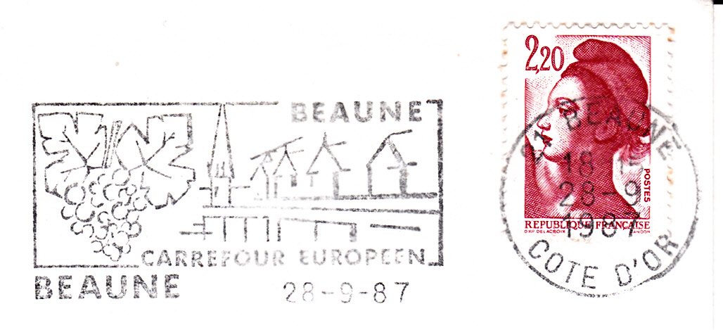 Von diesem Maschinenwerbestempel aus Beaune hier noch eine Variante vom 20.10.1987: im Werbeeinsatz rechts unten steht hier kein Datum, wie dies bei anderen Stempeln stets üblich war.