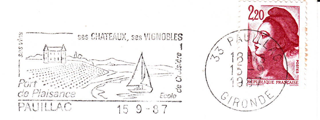 Auf diesem Maschinenwerbestempel vom 15.9.1987 sehen wir Weinberge bei Pauillac.