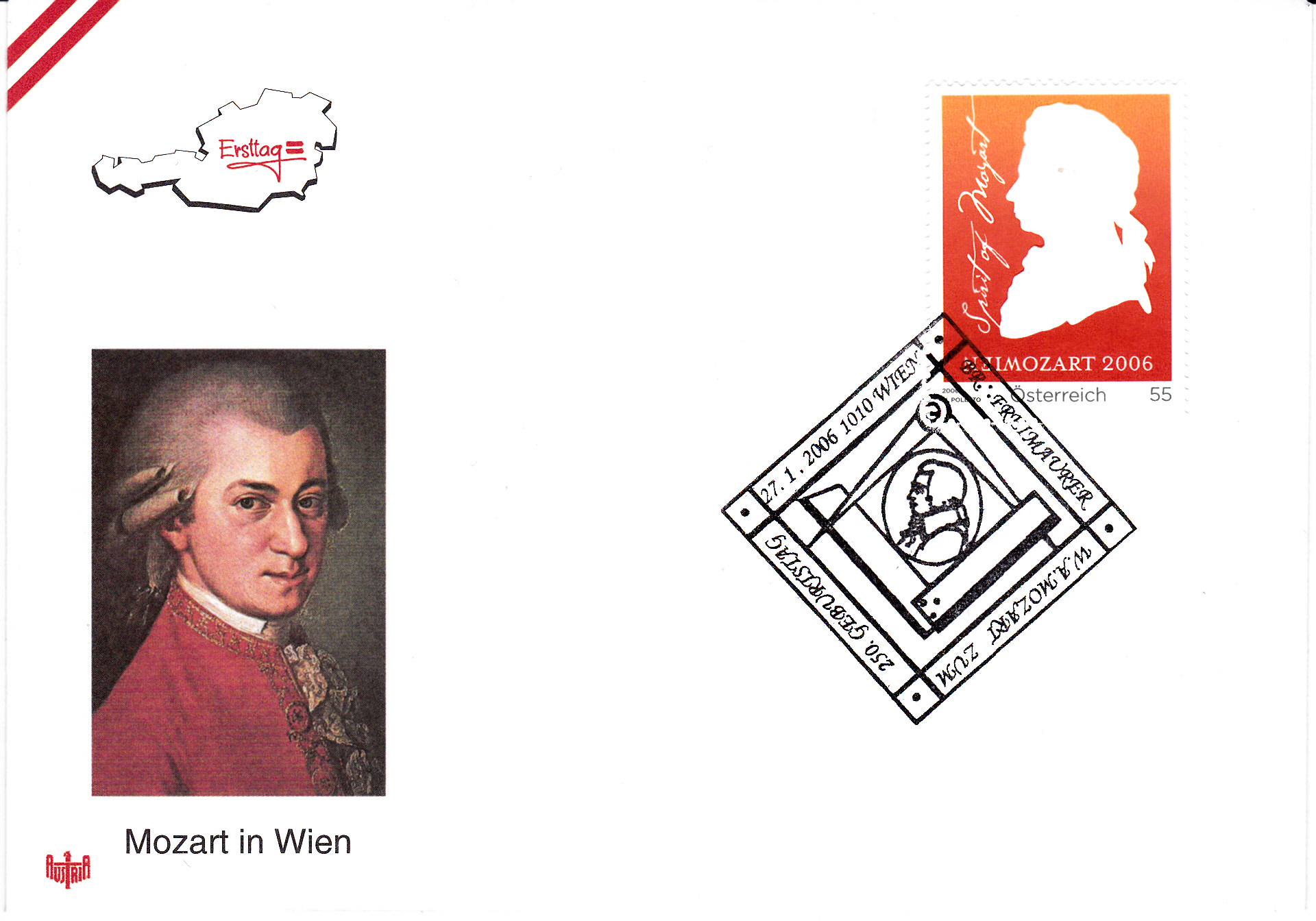 Am 27.1.2006 erschien in Österreich diese Marke (MiNr 2572) zum 250. Geburtstag von W.A.Mozart. Hier ein Exemplar mit motivgleichem Sonderstempel vom Ersttag aus Salzburg.