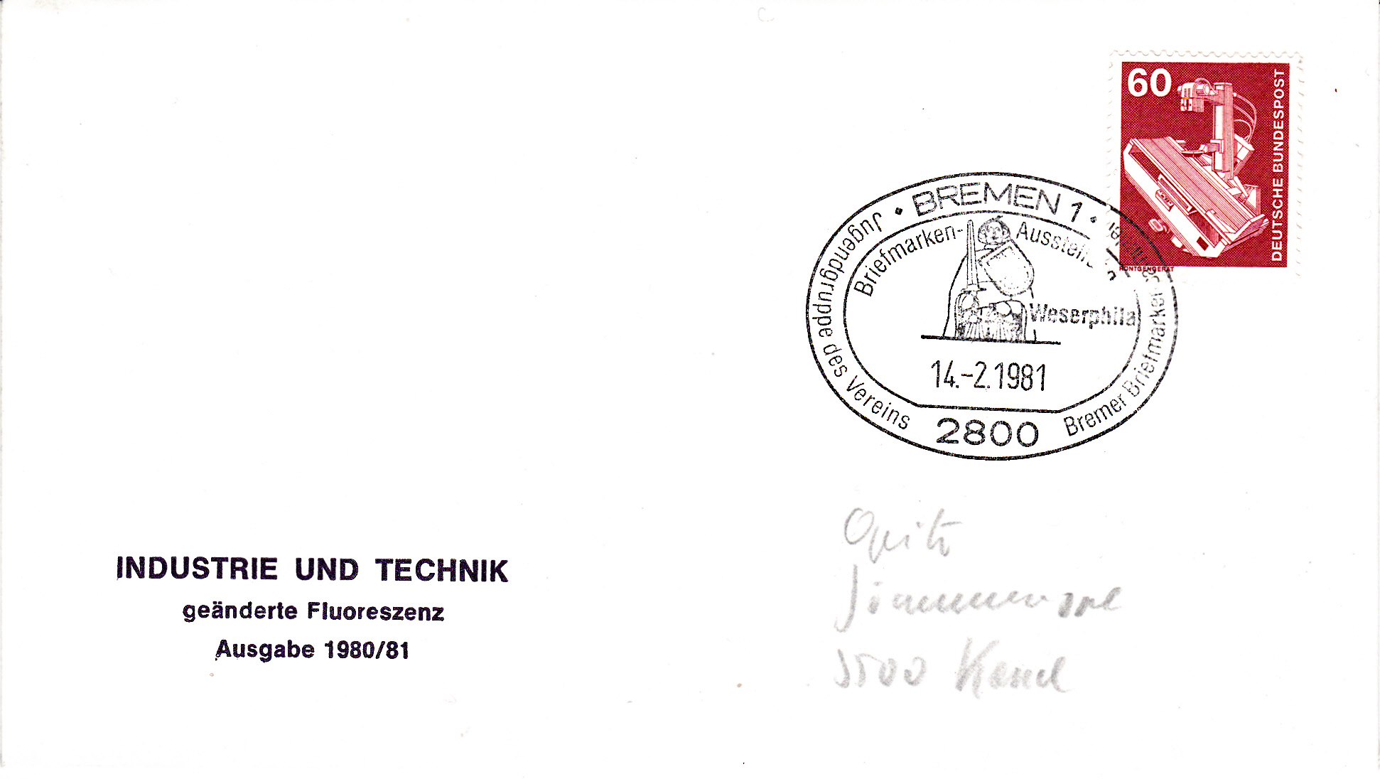 60Pf-Wert der Dauerserie Industrie und Technik als Einzelfrankatur portogerecht auf einem Brief bis 20 g entwertet mit einem Sonderstempel aus 2800 Bremen zur Briefmarkenausstellung "Weserphila". Solche Briefe wurden zur damaligen Zeit von einem Händler vermutlich in einer grö0eren Anzahl aufgegeben, da in den Jahren ab 1980/84 dem Papier neben der fluoreszierenden Substanz auch Aufheller beigegeben wurden, so dass die Marken unter der UV-Lampe nicht gelb sondern weißlich fluoreszieren.