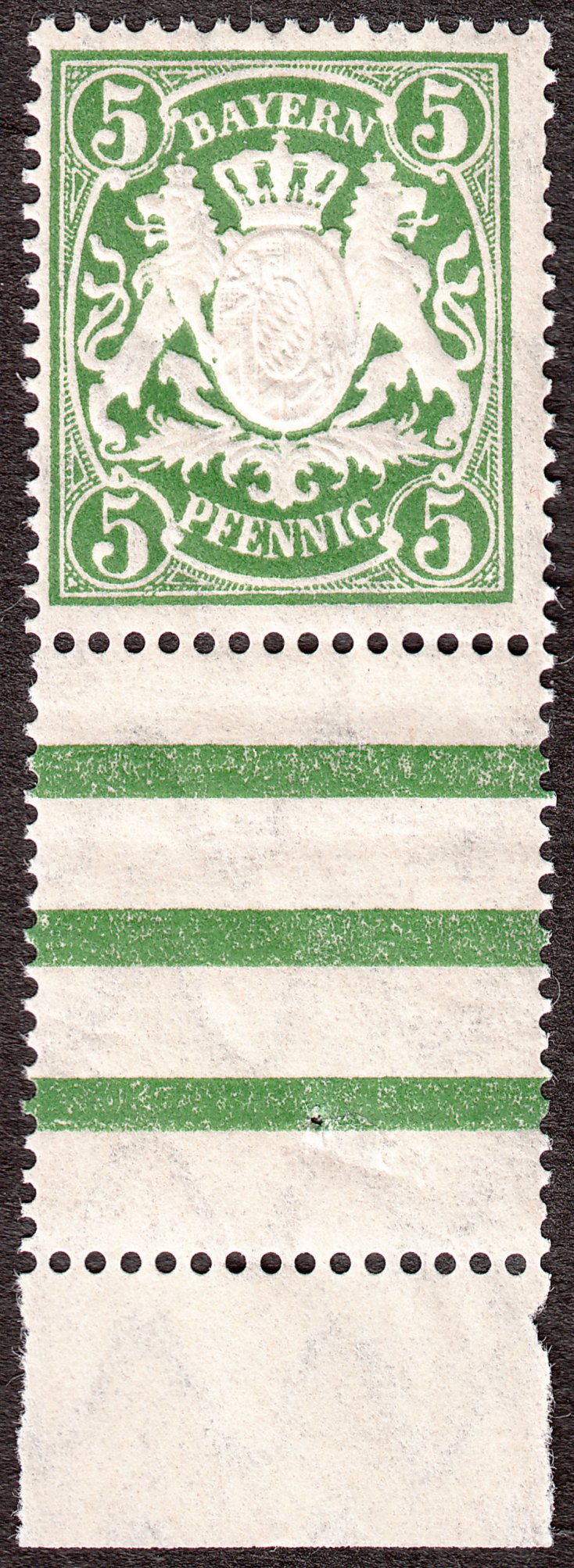 Hier ein Exemplar der Wertstufe zu 5 Pfennig in grün, MiNr. 61 y L, mit Bogenrandfeld am Unterrand wie ein Zwischensteg Type II: