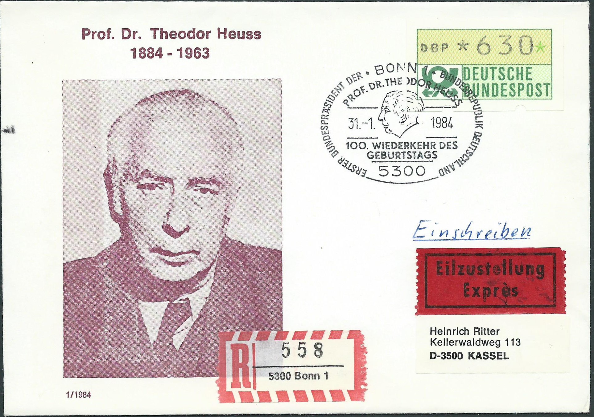 Den Anfang macht ein Einschreiben-Eilbrief mit einer ATM 1 zu 630 Pf. Da muss ich ehrlich gestehen, ich habe hier beim Kauf nicht auf die Portostufe geachtet, mich hat nur die hohe Wertstufe der ATM interessiert. Die sind sonst auch nicht so einfach zu finden. Dass der Beleg trotzdem vom Porto richtig ist, habe ich erst hier nachgeschlagen. 80 Pf Briefgebühr, dazu 2,-- DM Einschreiben und 3,50 DM Eilzustellung, macht genau 6,30 DM.