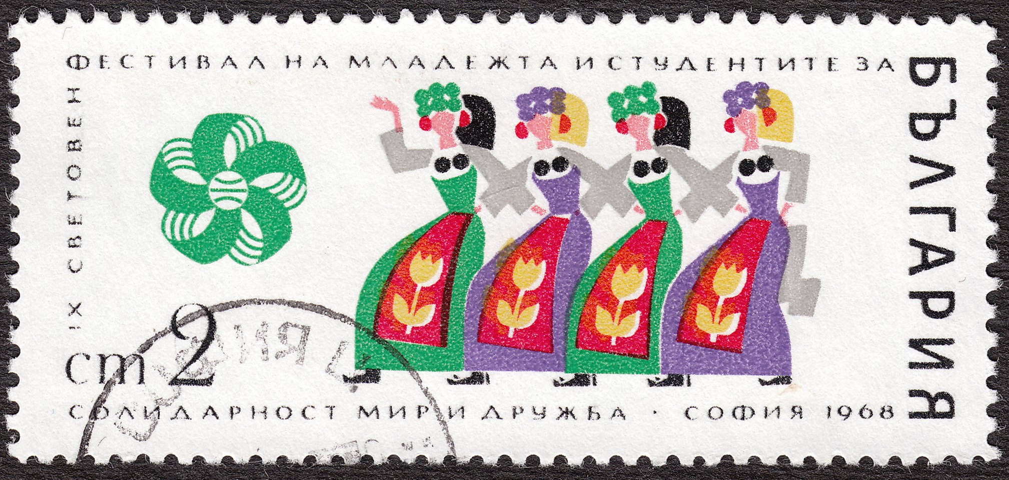 Diese am 20.03.1968 zu den Jugend-Weltfestspielen in einer Auflage von 1.500.000 Stück erschienene MiNr. 1786 zeigt als Motiv vier Volkstänzerinnen: