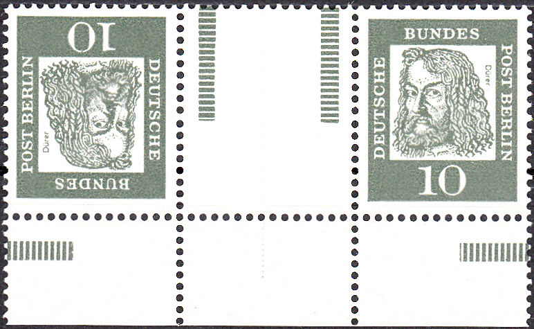 Kehrdruckpaar des 10 Pfennigwertes Dürer aus einem Markenheftchenbogen (MiNr K 3).