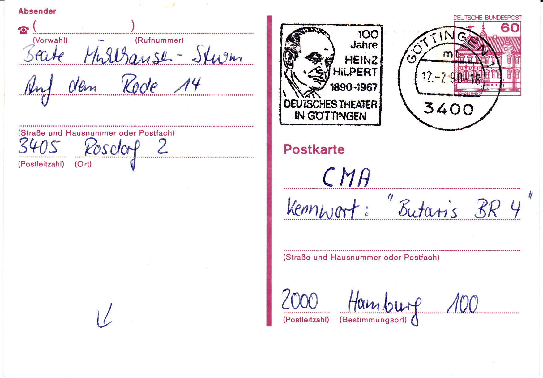 Handwerbestempel vom 12.2.1990 aus Göttingen mit einem Porträt von Heinz Hilpert im Werbeeinsatz.