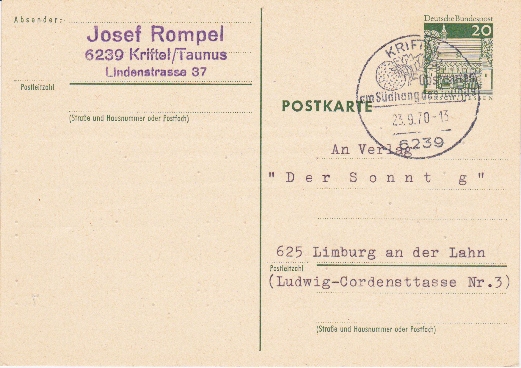 Handwerbestempel vom 23.9.1970 aus 6239 Kriftel mit dem Textzusatz "Obstgarten am Südhang des Taunus" und der Abbildung einer Erdbeere.