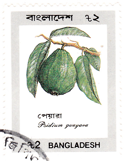 Auf dieser Marke zu 2 Taka aus Bangladesch (MiNr 335) ist eine Guave an einem Zweig abgebildet.