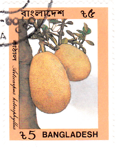 Auf dieser Marke zu 5 Taka aus Bangladesch (MiNr 338) hängen Jackfrüchte am Stamm eines Jackfruchtbaumes.