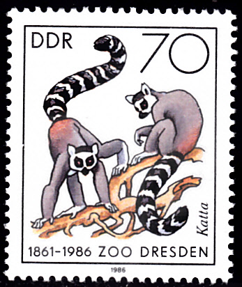 Als letzte Marke dieser Serie der DDR zeige ich die Marke zu 70Pf (MiNr 3022) mit zwei Kattas (Lemur catta).