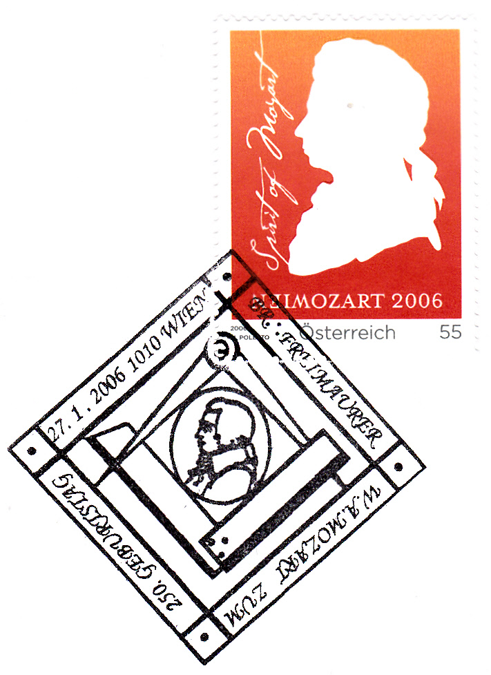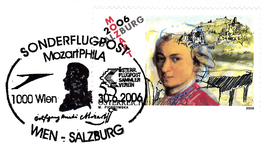 Am 30.6.2006 erschien in Österreich eine weitere Marke (MiNr 2603) zum 250. Geburtstag von W.A.Mozart. Hier ein Exemplar mit einem Sonderstempel von der Sonderflugpost Wien-Salzburg am Ersttag der Marke.