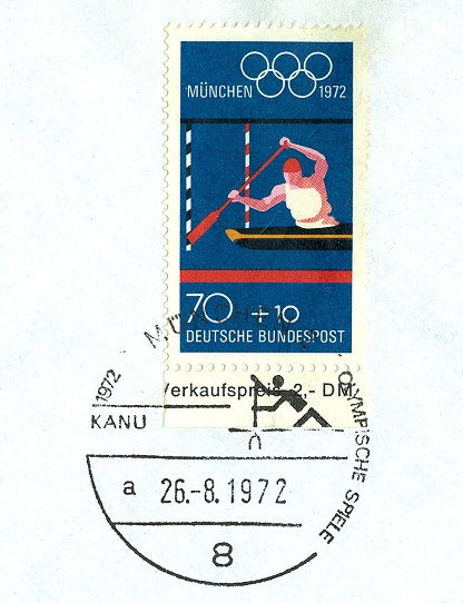 In diesem Sonderstempel "Kanu" aus dem Jahr 1972 ist als Stempelinhalt ein Kanuslalomsportler in seinem Einer-Canadier, kurz C1, dargestellt. Er entwertet eine ziemlich "unfrische" MiNr. 737 (Kanuslalom Einer-Kajak, K1).
