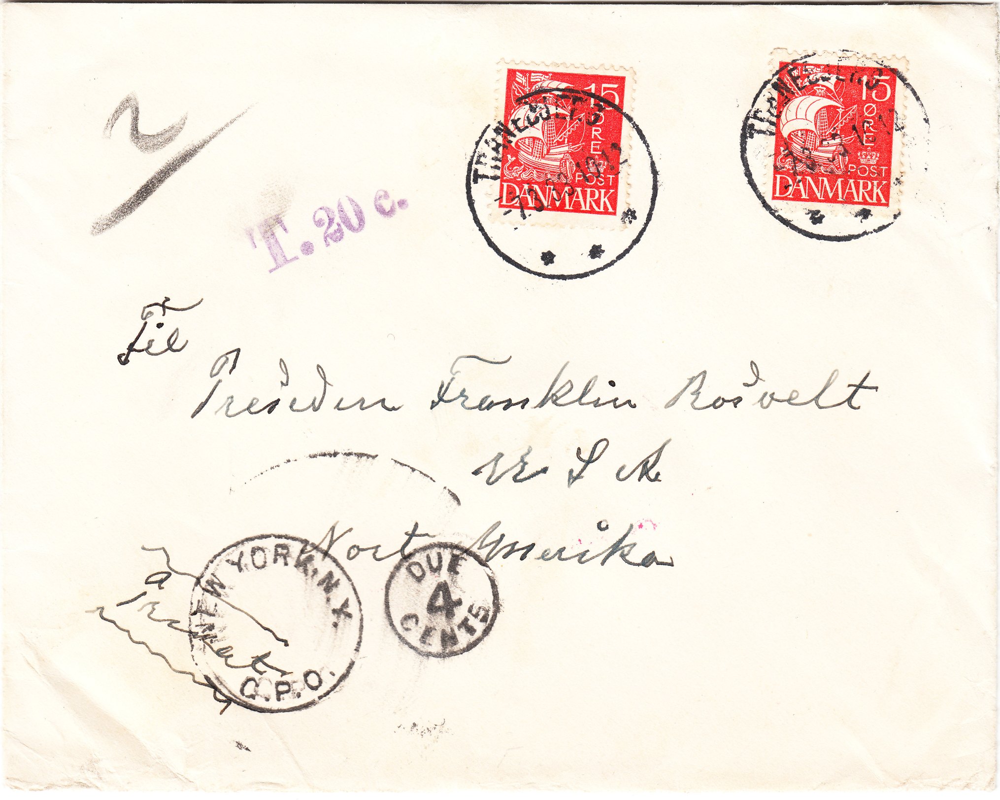Es handelt sich um einen an Roosevelt adressierten am 07.03.1933 in Tranebjerg in Dänemark aufgegebenen Brief, freigemacht mit einer Mehrfachfrankatur zweier dänischer Freimarken zu 15 Öre.