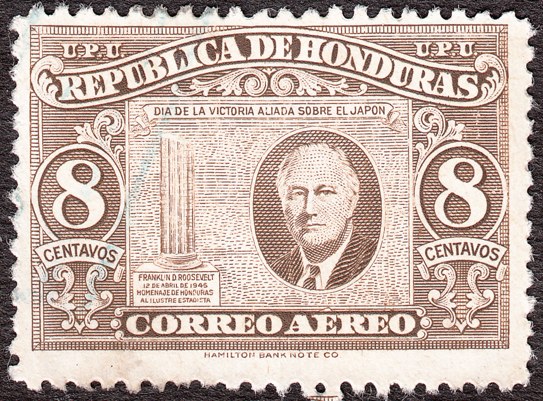 Dieses Postwertzeichen erschien zum Sieg der Alliierten über Japan im Oktober 1945 in Honduras in zwei Versionen, die Type I zeigt als Inschrift unter der Säule "F.D.R", die hier gezeigte Type II "FRANKLIN D.ROOSEVELT":