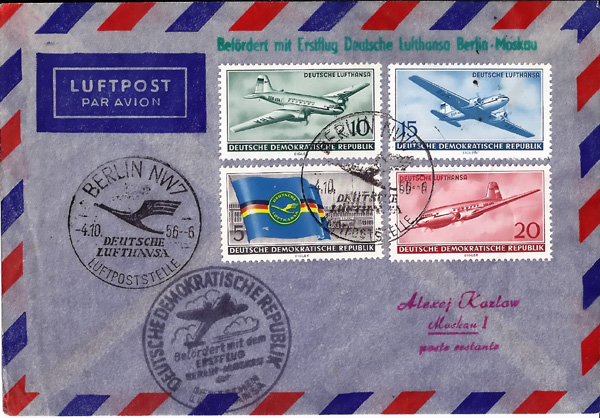mit 4 Werten frankiert, herausgegeben am 1. Febr. 1956 zur Eröffnung der zivilen Luftfahrt in der DDR