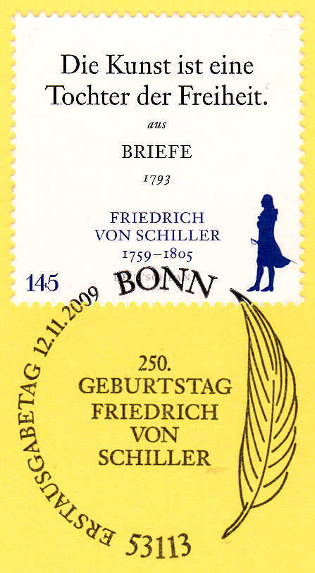 Am 12.11.2009 erschien zum 250.Geburtstag von Friedrich von Schillerbei der Deutschen Post eine Sondermarke (MiNr 2765) mit einer Abbildung von Schiller (Scherenschnitt) und einem Zitat aus dem 2. Brief über die ästhetische Erziehung des Menschen.