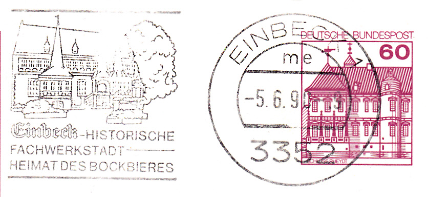 Hier ein weiterer Maschinenwerbestempel aus Einbeck mit Werbetext "Einbeck - historische Fachwerkstadt - Heimat des Bockbieres. Im Stempelbild ist das historische Rathaus zu sehen.