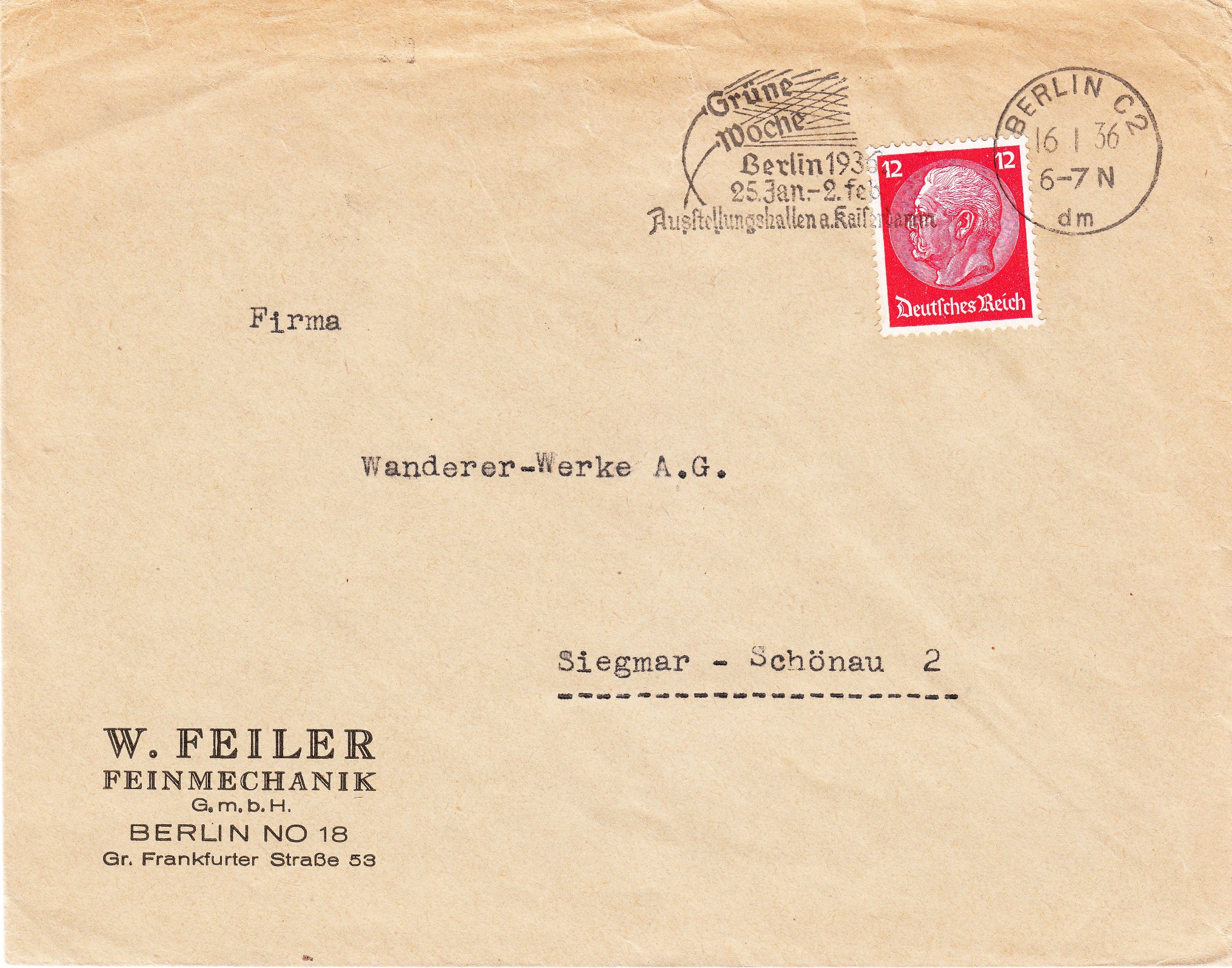 Hier ein Maschinenstempel vom 16.01.1936 mit Werbeeinsatz für die vom 25.01.1936 bis zum 02.02.1936 stattfindende "Grüne Woche Berlin 1936":
