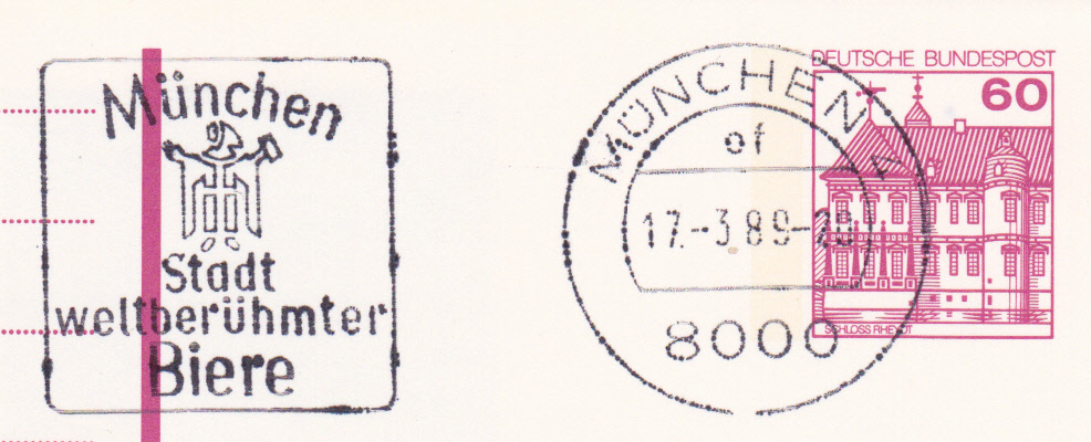 Maschinenwerbestempel vom 17.3.1989 aus 8000 München 4 mit Werbeeinsatz "München Stadt weltberühmter Biere" mit vierstelliger Postleitzahl hier nun mit den Kennbuchstaben "of" statt "fv" (wie bereits früher gezeigt).