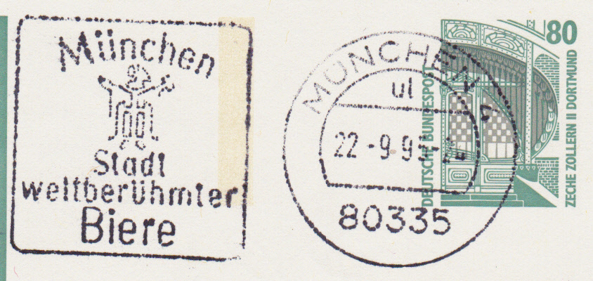 Maschinenwerbestempel vom 22.9.1995 aus 80335 München 4 mit dem Werbeeinsatz "München Stadt weltberühmter Biere" jetzt mit fünfstelliger Postleitzahl mit den Kennbuchstaben "ul".