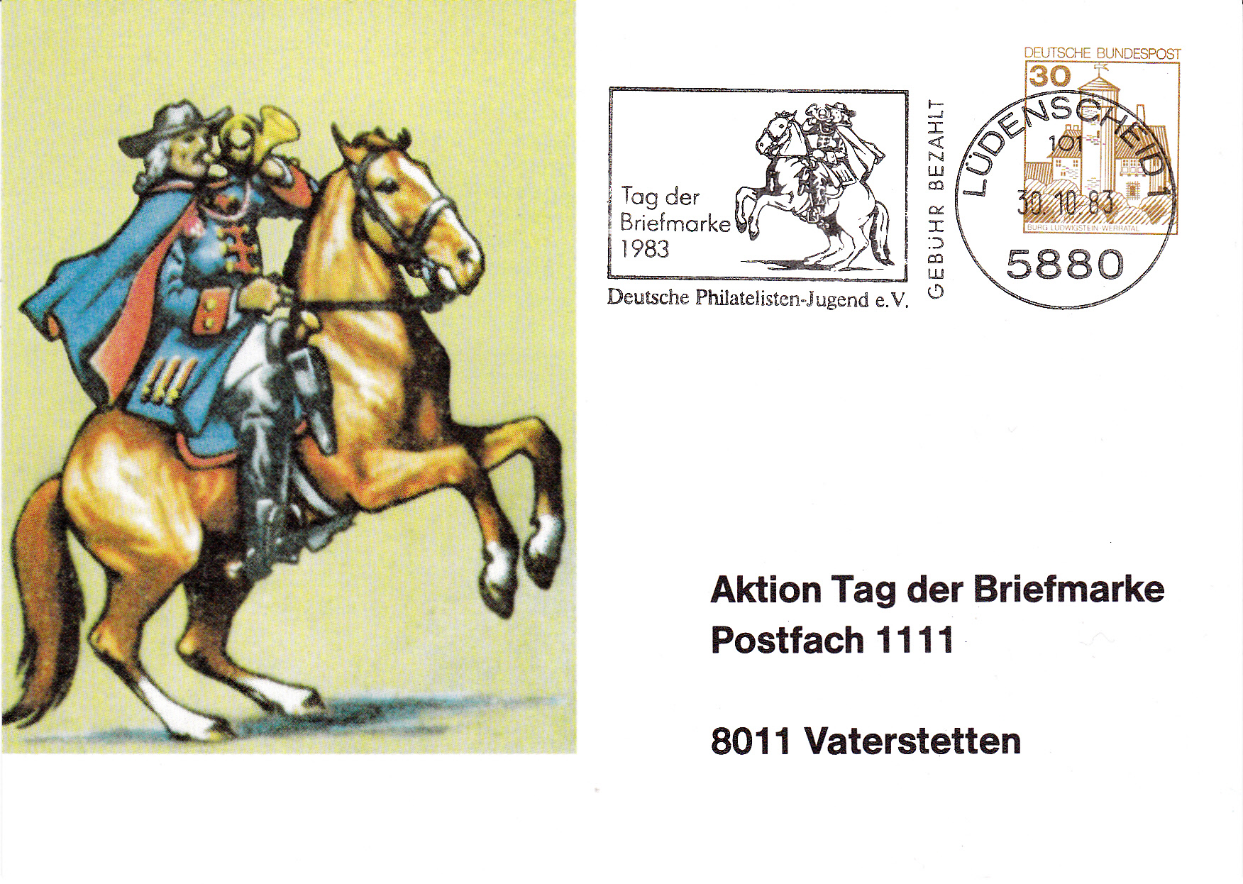 Ganzsachenpostkarte als Massendrucksache zum Tag der Briefmarke mit einem Absenderentwerterstempel vom 30.10.83 zum Tag der Briefmarke 1983 aus Lüdenscheid.
