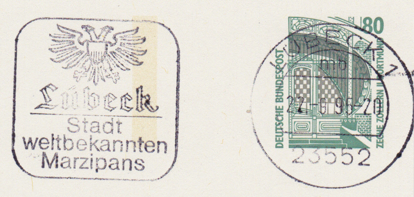 Maschinenwerbestempel aus Lübeck vom 10.2.1990 mit Kennbuchstaben "ns" und Werbeeinsatz "Lübeck Stadt weltbekannten Marzipans".