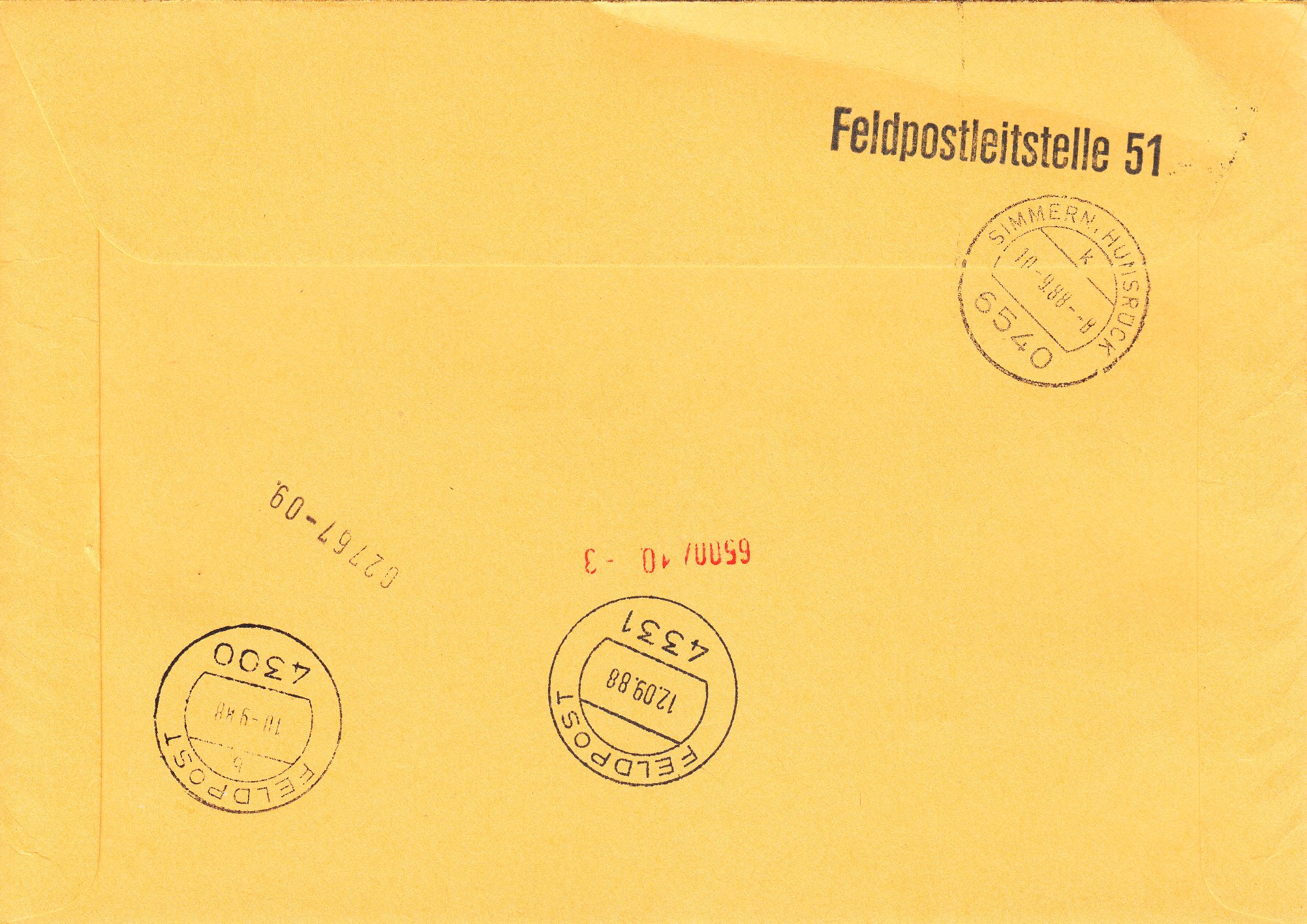 Rückseitig finden sich einige Durchgangsstempel, wobei der Stempel "FELDPOST 4331" = Feldpostamt Müllenbach - MatAusgSt Ulmen vom 12.09.1988 eine falsche Einstellung des Datums hatte, denn der am 09.09.1988 aufgegebene Beleg kam bereits am 10.09.1988 an seinem Bestimmungsort "5540 SIMMERN" an!