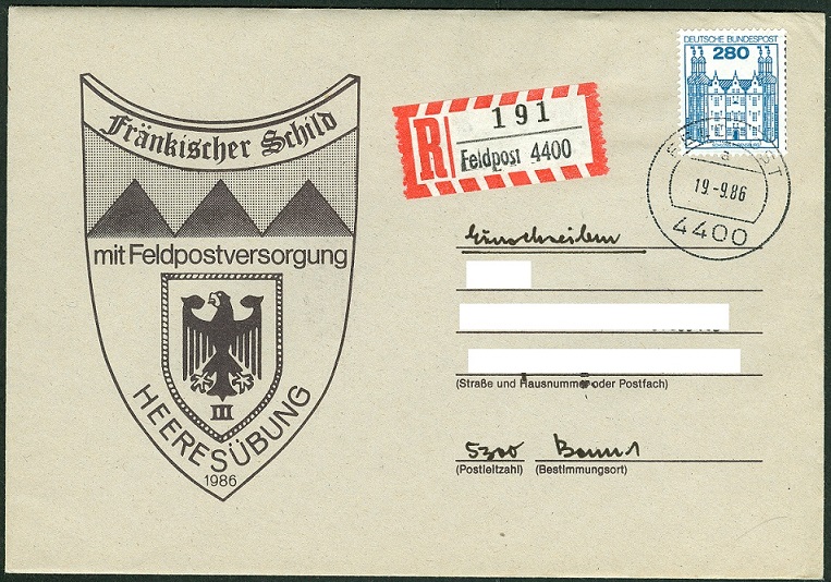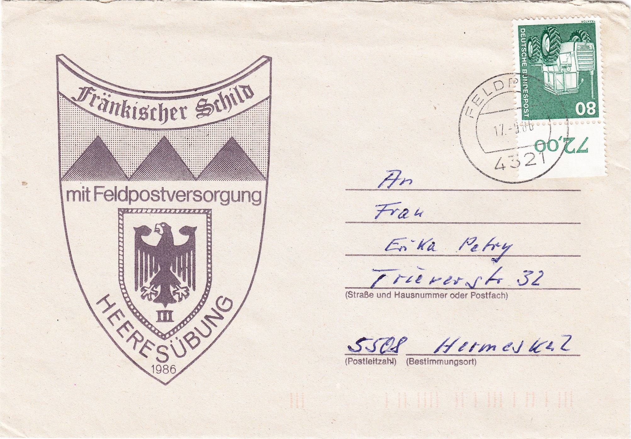 Dieser Brief wurde während der Heeresübung "Fränkischer Schild" am 17.9.1986 beim Feldpostamt 4321, dem Feldpostamt Trier der Nachschubkompanie 540, aufgegeben.
