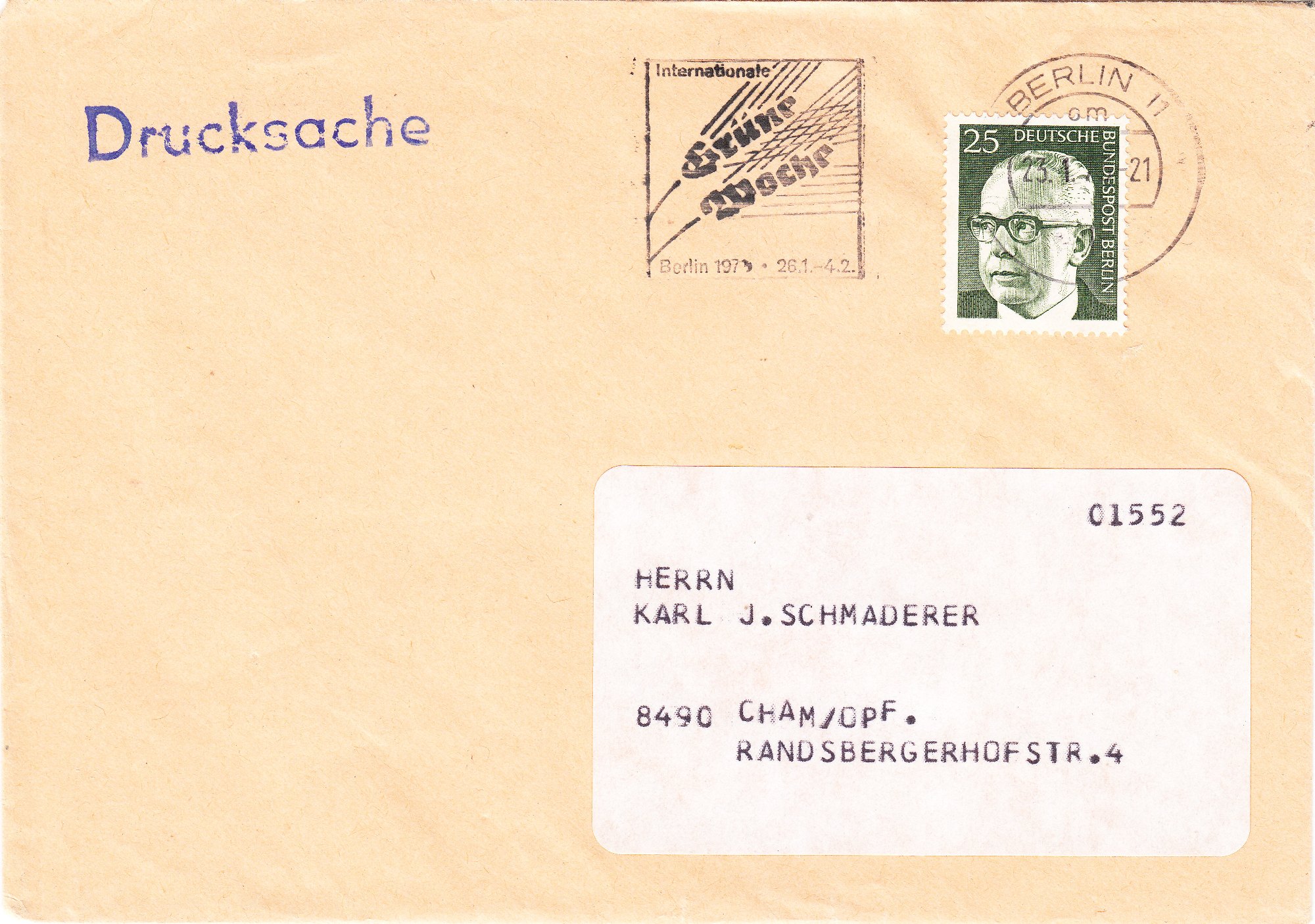 Dieser Beleg wurde per Maschinenstempel mit Werbeeinsatz "Internationale Grüne Woche Berlin 1973 26.1. - 4.2. mit den Kennbuchstaben "om" entwertet: